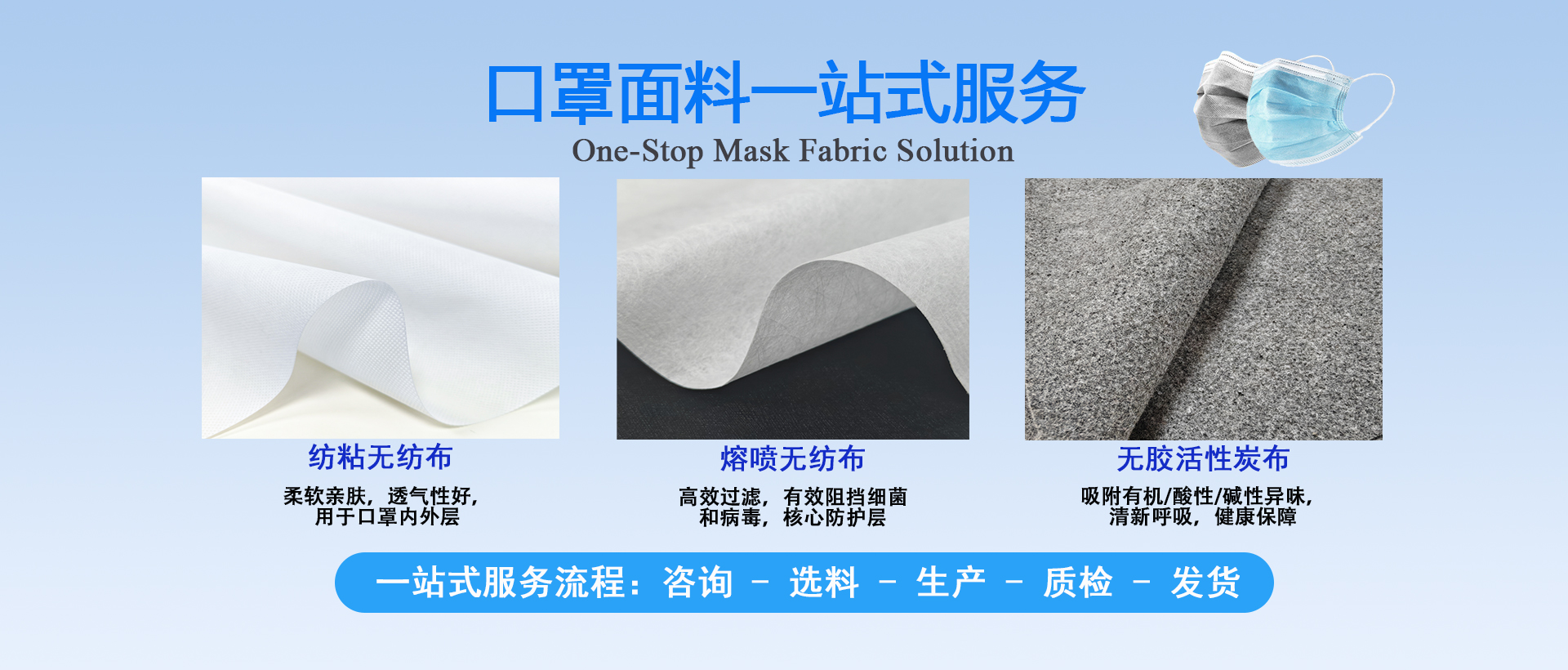 擁有10萬級凈化車間,500平方米研究生實(shí)驗(yàn)室,紡粘無紡布和水駐極熔噴布生產(chǎn)線;年產(chǎn)布料10000噸